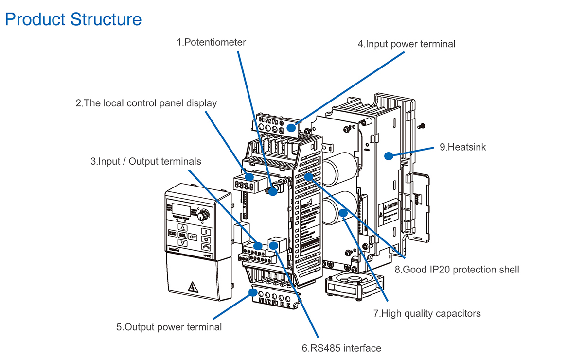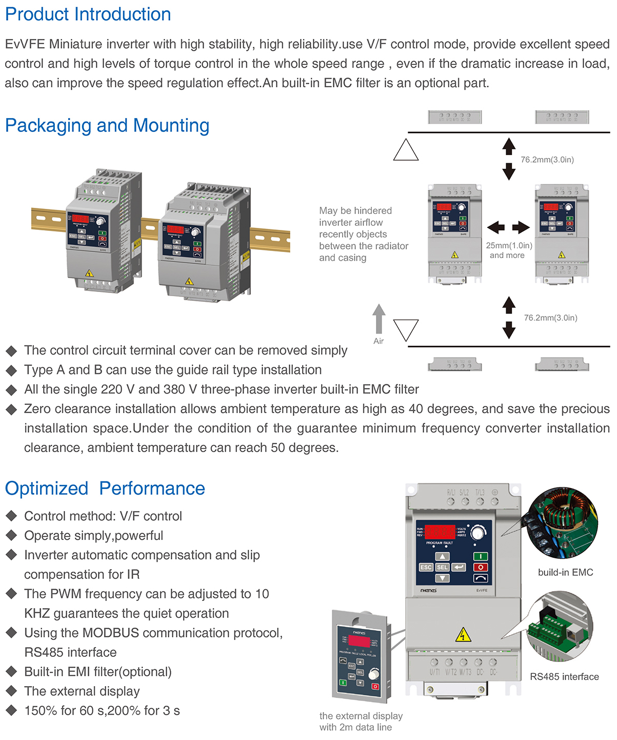 HPVFE Miniature inverter with high stability, high reliability.use V/F control mode, provide excellent speed control and high levels of torque control in the whole speed range , even if the dramatic increase in load, also can improve the speed regulation effect.An built-in EMC filter is an optional part.