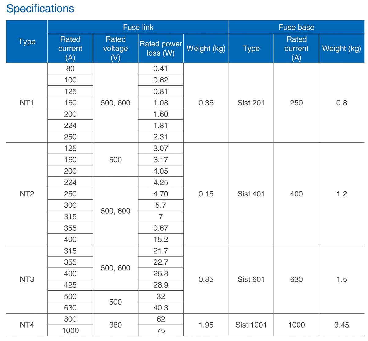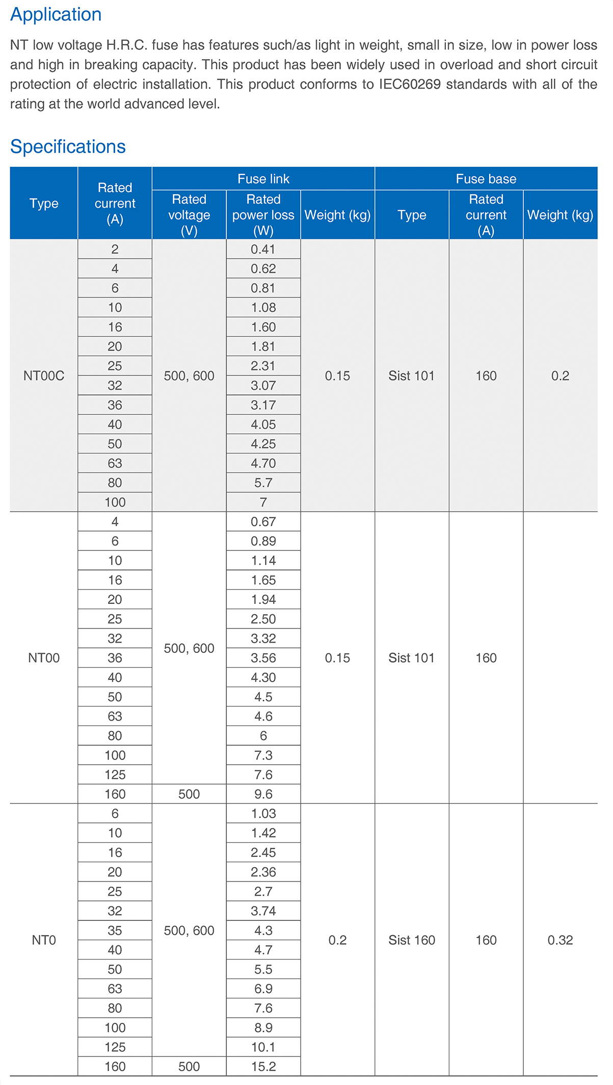NT low voltage H.R.C. fuse has features such/as light in weight, small in size, low in power loss and high in breaking capacity. This product has been widely used in overload and short circuit protection of electric installation. This product conforms to IEC60269 standards with all of the rating at the world advanced level.