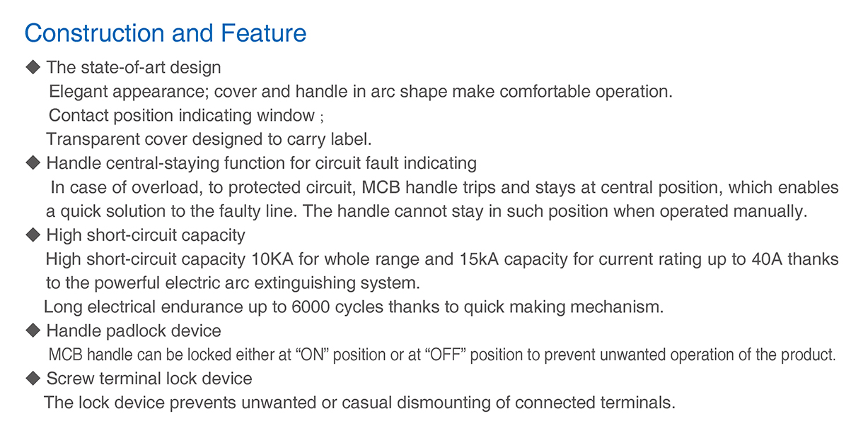 MCB handle can be locked either at “ON” position or at “OFF” position to prevent unwanted operation of the product.