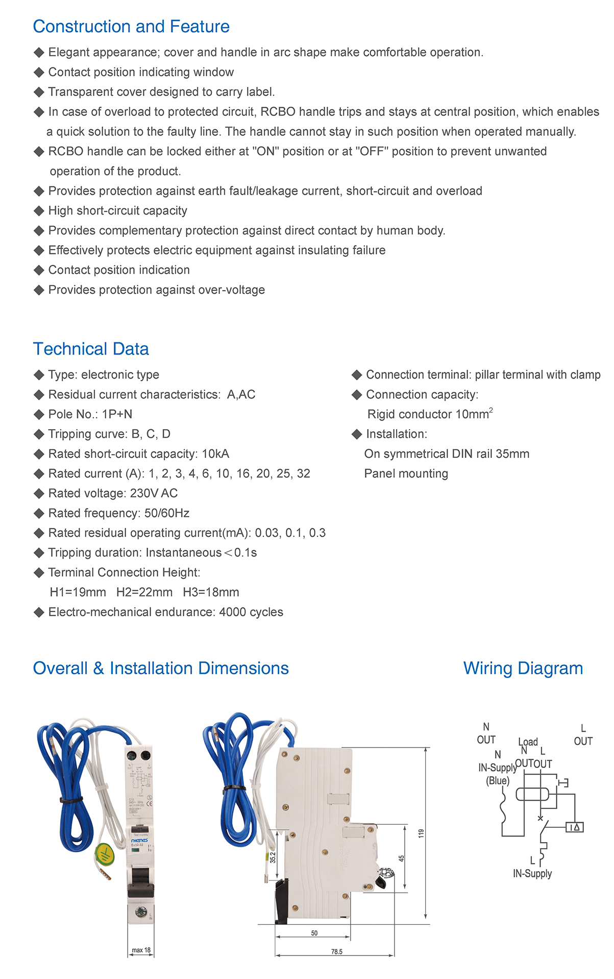 ◆ Provides protection against earth fault/leakage current, short-circuit and overload